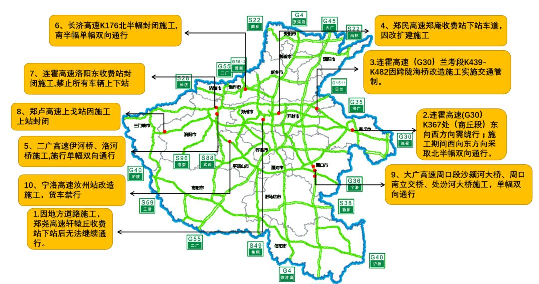 1、因地方道路施工,在郑西高速轩辕丘下站后无法继续通行,请车辆注意提前绕行其他站口下站。