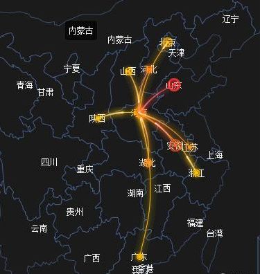 图3.出省高速车流迁徙(郑州为中心)示意图